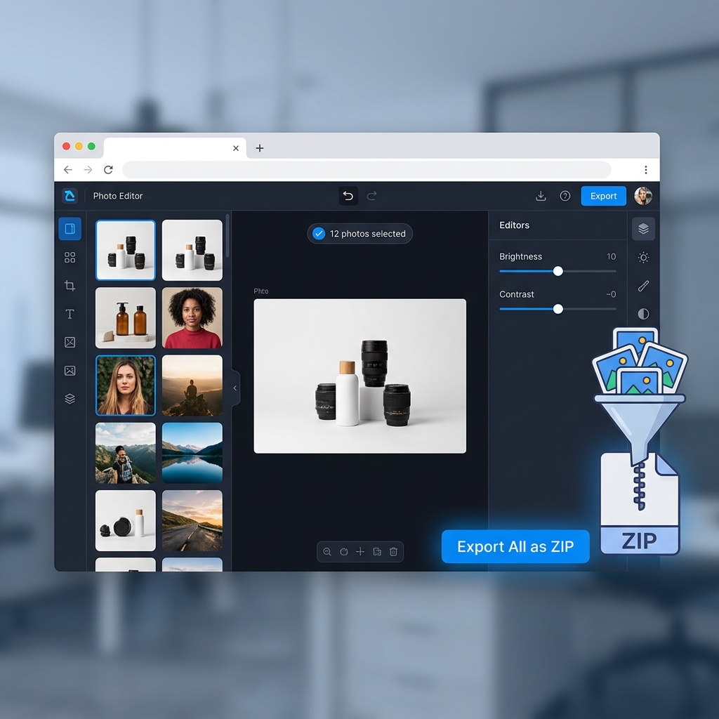 O PhotoEditor.Studio oferece edição em lote 100% gratuita, diretamente no navegador, sem instalação de nenhum software. Importe quantas fotos precisar, configure os ajustes e exporte tudo em um arquivo ZIP — com privacidade total, pois nenhuma imagem é enviada a servidores externos.