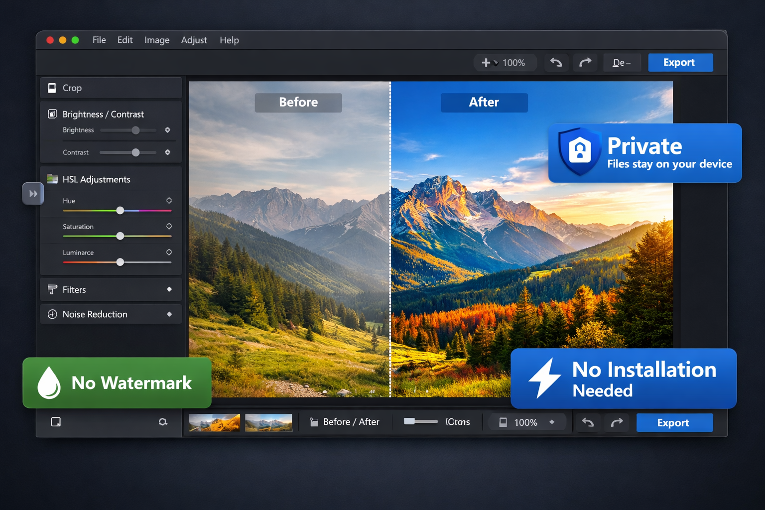 Isso significa privacidade real, velocidade real e zero custo — independentemente de quantas fotos você editar.